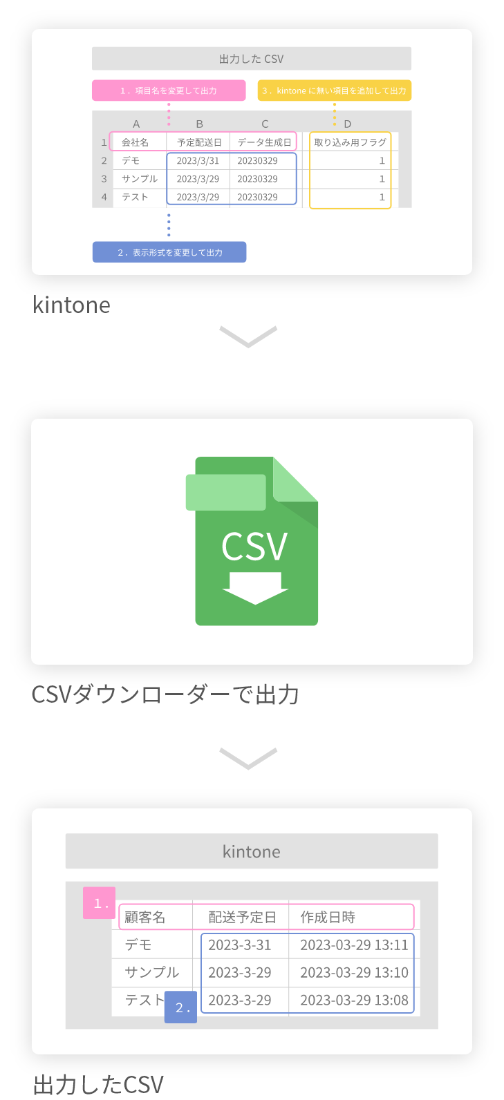 kintone上にあるデータをダウンロードする際に、連携先システムの取り込み形式に合わせて出力することが可能です。