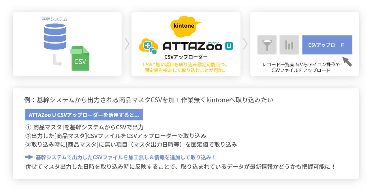 kintone 標準機能での取り込みと比べ、取り込み時にCSVに無い項目を追加したり、固定値を入れて取り込めます。