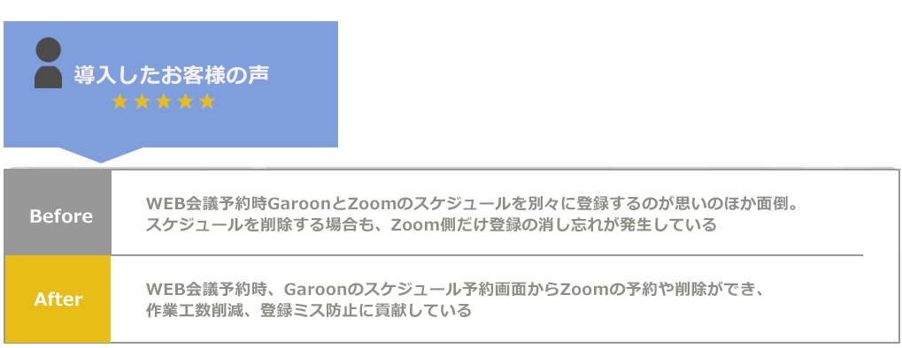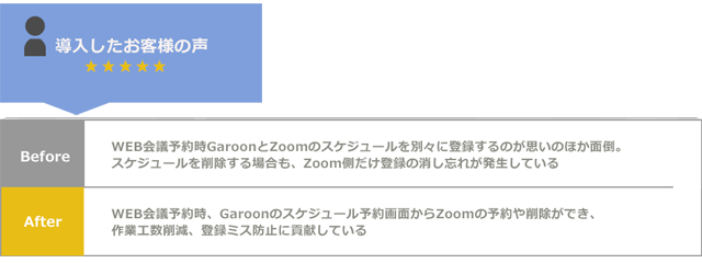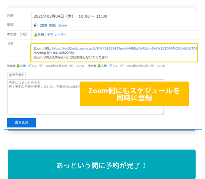 GaroonおよびZoomにスケジュールが同時に登録され、Garoon上にZoomのURLが反映されます。