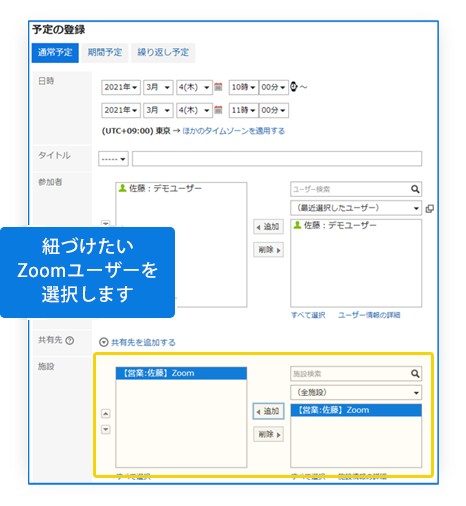 Garoonで会議スケジュール登録時、紐づけたいZoomユーザーを選択します。